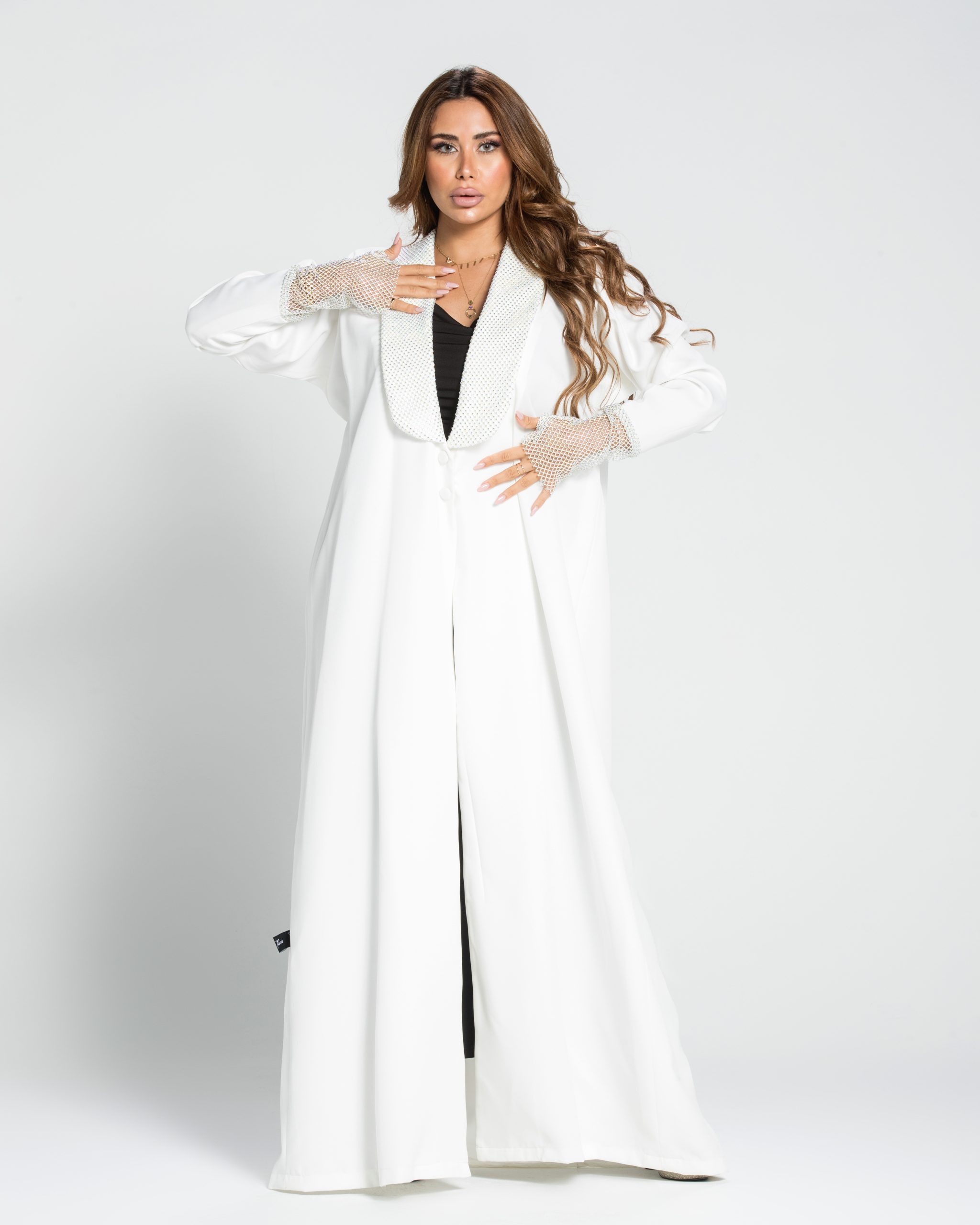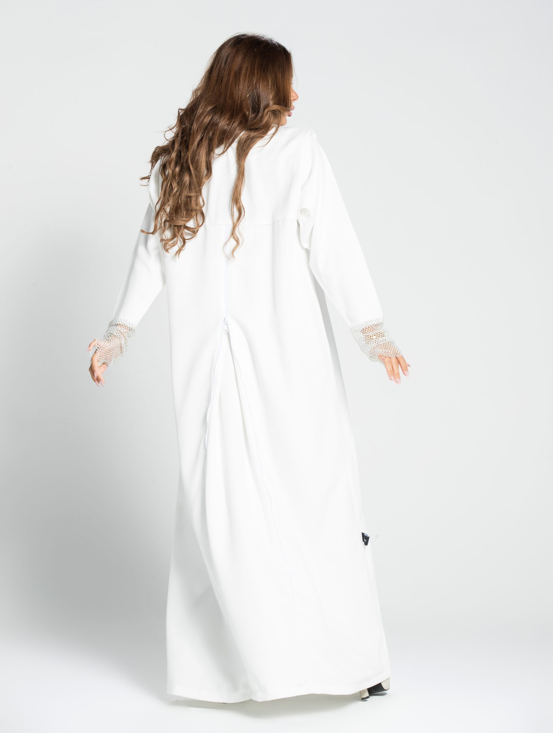 White Stone Abaya with a zipper at the back and stone on cliff and chest.